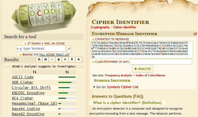 seemed like a cipher maybe since doing intext:"5757314e65474e5962484a4f656d787457544e424e574648555446684d3070735930684b616c70555a7a566b52335276546b686b65575248647a525a57466f77546b64334d6b347a526d685a6255313459316873636b35366247315a4d304531595564476130355864486c6157454a3557544a564e453959556e4a685246497a5932355363303948526a4a6b52464a7a546d706b65466c525054303d" returned writeups only