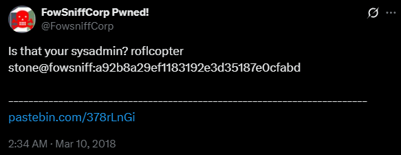@fowsniffcorplets visit that and get some creds https://x.com/fowsniffcorp- the pastebins are unavailable. one tweet with creds is available tho