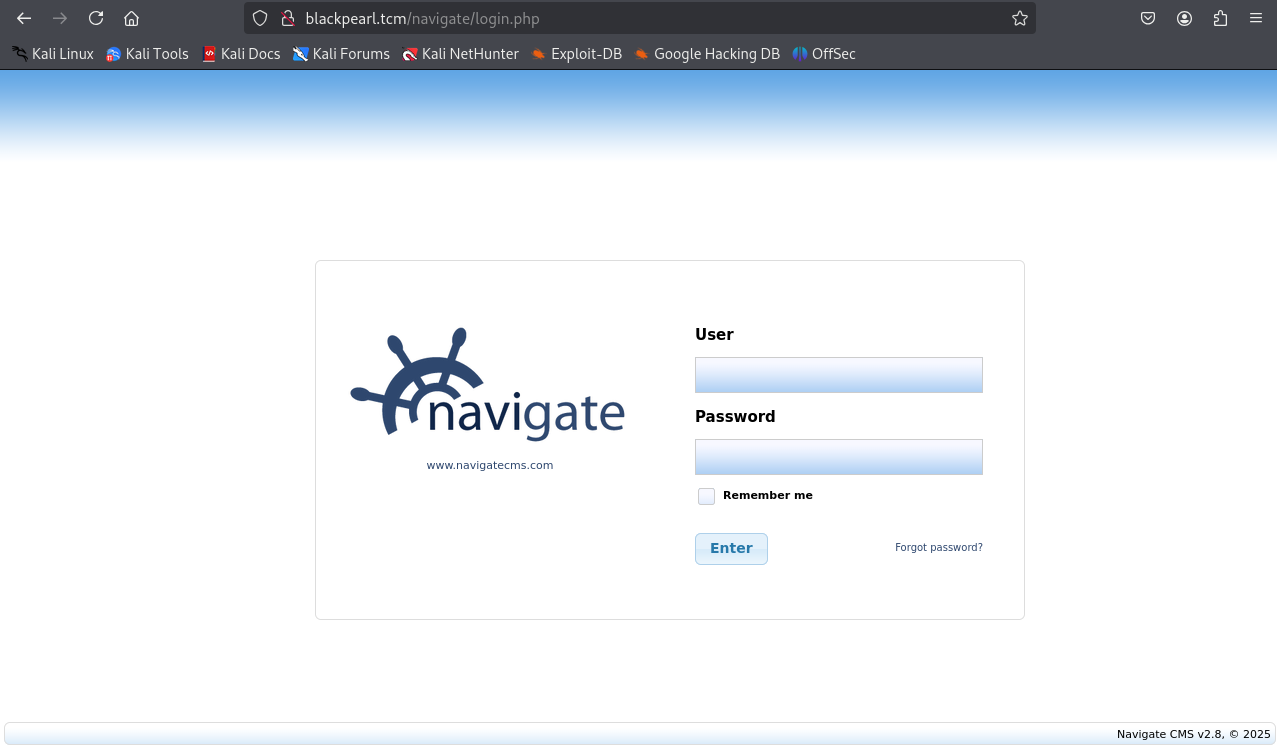 navigatewhich redirects tohttp://blackpearl.tcm/navigate/login.php - gets us this page with the navigate CMS