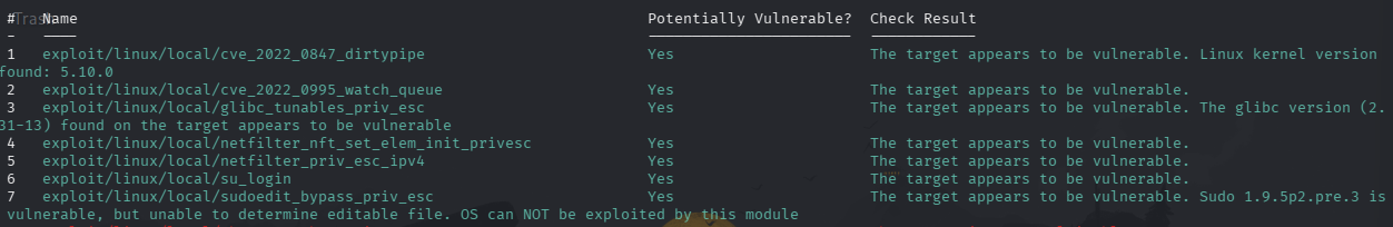 # Name Potentially Vulnerable? Check Result - ---- ----------------------- ------------ 1 exploit/linux/local/cve_2022_0847_dirtypipe Yes The target appears to be vulnerable. Linux kernel version found: 5.10.0 2 exploit/linux/local/cve_2022_0995_watch_queue Yes The target appears to be vulnerable. 3 exploit/linux/local/glibc_tunables_priv_esc Yes The target appears to be vulnerable. The glibc version (2.31-13) found on the target appears to be vulnerable 4 exploit/linux/local/netfilter_nft_set_elem_init_privesc Yes The target appears to be vulnerable. 5 exploit/linux/local/netfilter_priv_esc_ipv4 Yes The target appears to be vulnerable. 6 exploit/linux/local/su_login Yes The target appears to be vulnerable. 7 exploit/linux/local/sudoedit_bypass_priv_esc Yes The target appears to be vulnerable. Sudo 1.9.5p2.pre.3 is vulnerable, but unable to determine editable file. OS can NOT be exploited by this module
