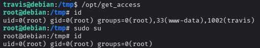/opt/get_access owned by root was something that had its suid set. lets check what it does. seems sus.