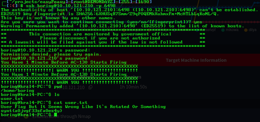 yup tryhackme slurped that up. onto the next answer. asks for the ssh password. gonna keep hydra bruteforcing ssh with rockyou while i do further enumeration