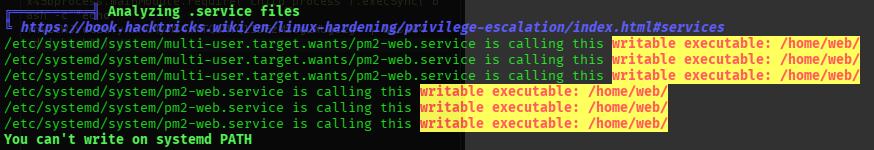 /etc/systemd/system/multi-user.target.wants/pm2-web.service is calling this writable executable: /home/web/