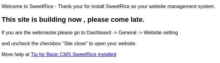 s:9:"close_tip";s:454:"<p>Welcome to SweetRice - Thank your for install SweetRice as your website management system.</p><h1>This site is building now , please come late.</h1><p>If you are the webmaster,please go to Dashboard -> General -> Website setting </p><p>and uncheck the checkbox \"Site close\" to open your website.</p><p>More help at <a href=\"http://www.basic-cms.org/docs/5-things-need-to-be-done-when-SweetRice-installed/\">Tip for Basic CMS SweetRice installed</a></p>";