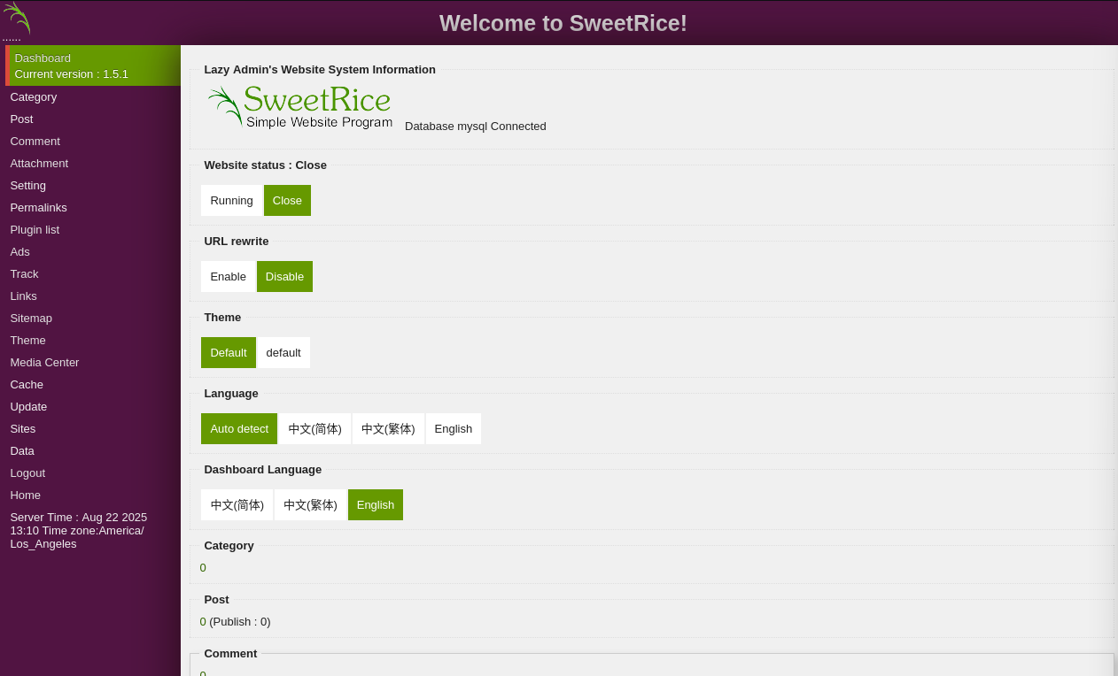 'INSERT INTO `%--%_options` VALUES(\'1\',\'global_setting\',\'a:17:{s:4:\\"name\\";s:25:\\"Lazy Admin's Website\\";s:6:\\"author\\";s:10:\\"Lazy Admin\\";s:5:\\"title\\";s:0:\\"\\";s:8:\\"keywords\\";s:8:\\"Keywords\\";s:11:\\"description\\";s:11:\\"Description\\";s:5:\\"admin\\";s:7:\\"manager\\";s:6:\\"passwd\\";s:32:\\"42f749ade7f9e195bf475f37a44cafcb\\";s:5:\\"close\\";i:1;s:9:\\"close_tip\\";s:454:\\"<p>Welcome to SweetRice - Thank your for install SweetRice as your website management system.</p><h1>This site is building now , please come late.</h1><p>If you are the webmaster,please go to Dashboard -> General -> Website setting </p><p>and uncheck the checkbox \\"Site close\\" to open your website.</p><p>More help at <a href=\\"http://www.basic-cms.org/docs/5-things-need-to-be-done-when-SweetRice-installed/\\">Tip for Basic CMS SweetRice installed</a></p>\\";s:5:\\"cache\\";i:0;s:13:\\"cache_expired\\";i:0;s:10:\\"user_track\\";i:0;s:11:\\"url_rewrite\\";i:0;s:4:\\"logo\\";s:0:\\"\\";s:5:\\"theme\\";s:0:\\"\\";s:4:\\"lang\\";s:9:\\"en-us.php\\";s:11:\\"admin_email\\";N;}\',\'1575023409\');'- cleaned it up and got it: